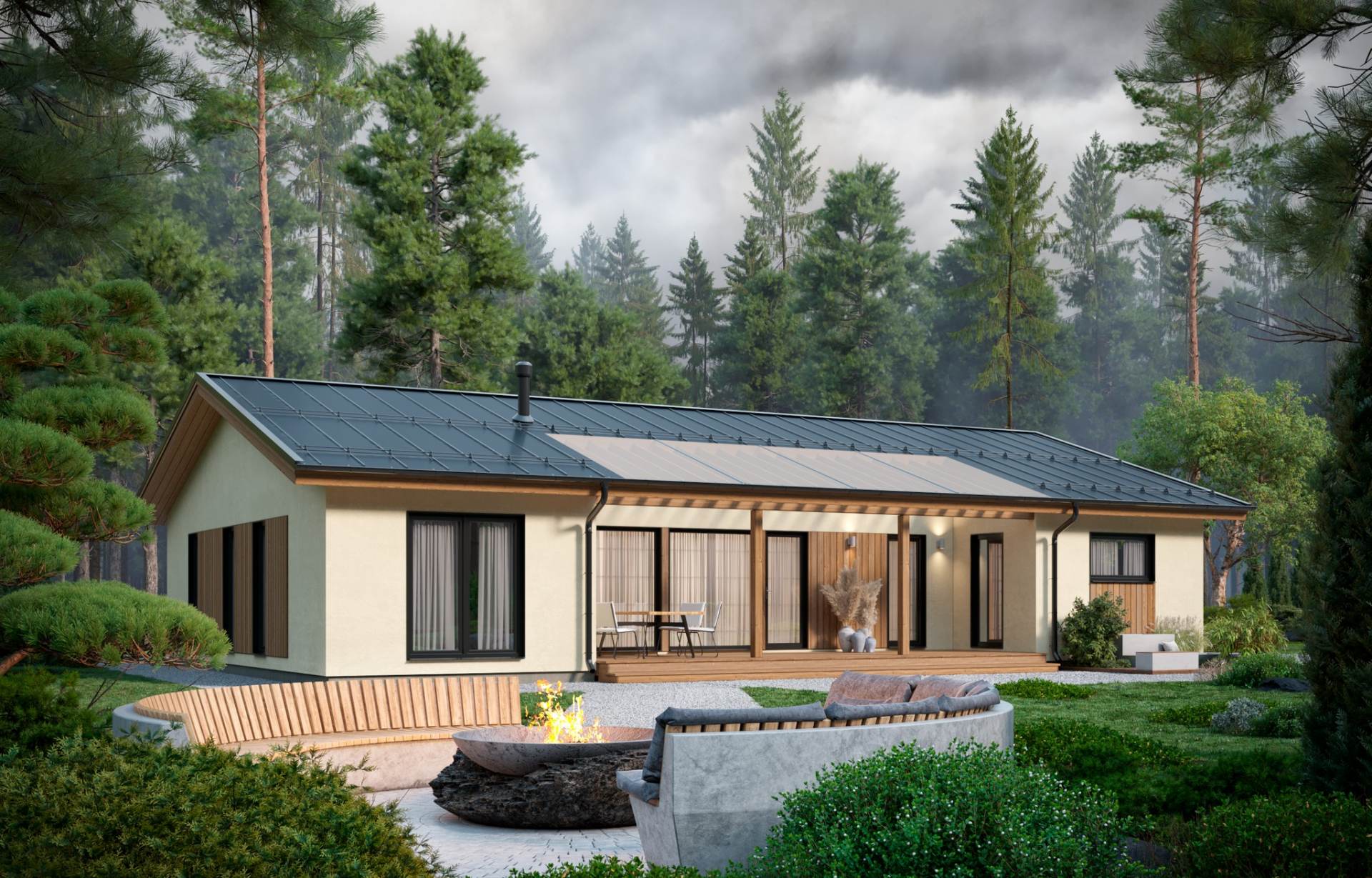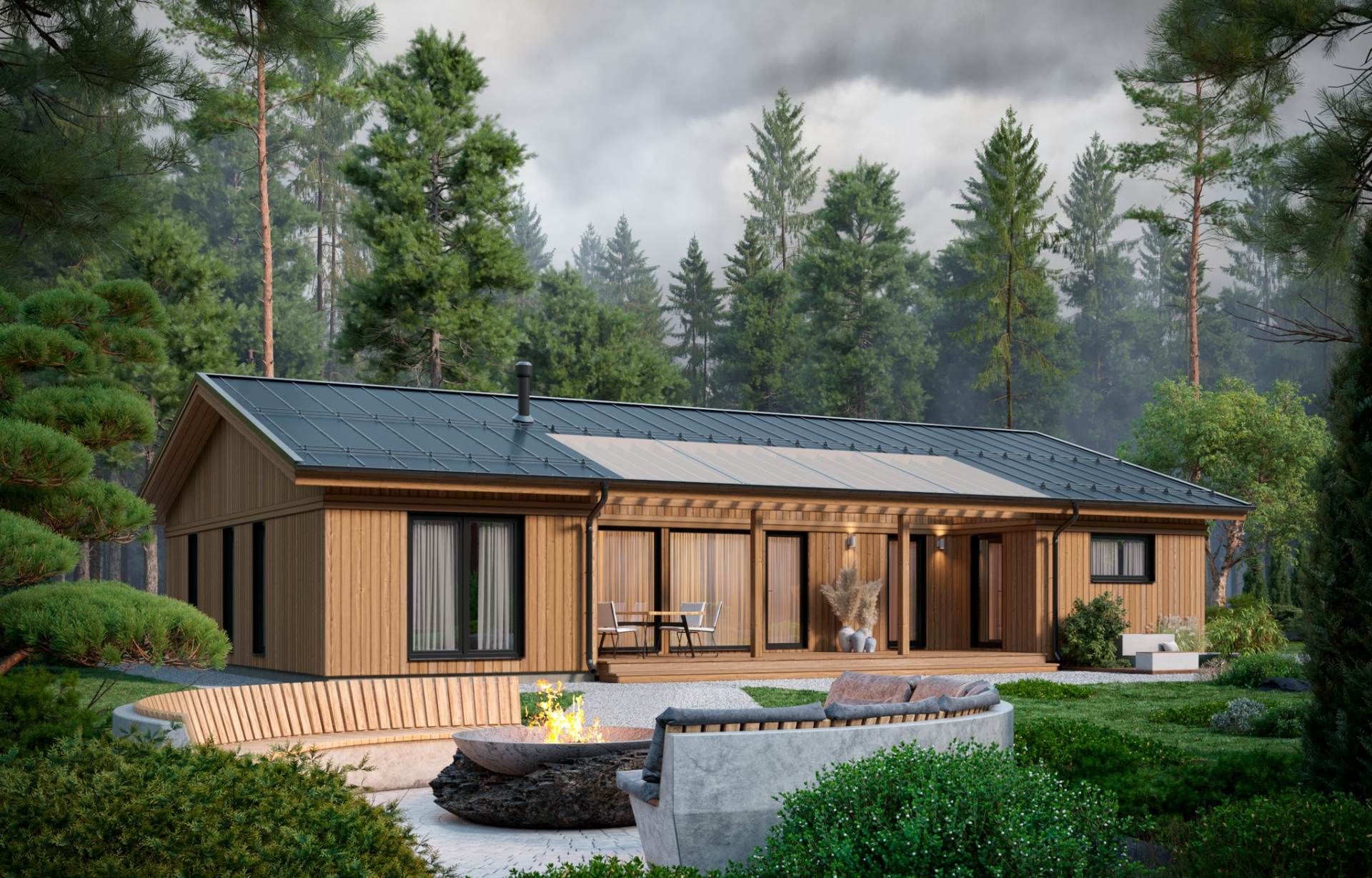 • Prefab энергоэффективные стеновые панели высокой заводской готовности из сухой, строганой, калиброванной доски с противопожарной фаской. Общее утепление 225мм с перекрытием мостиков холода (UMATEXTermo 200мм + звукоизоляционная плита Beltermo 25мм)